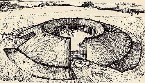 In Norfolk the earliest iron age phase is called after a site at West Harling, Micklemoor Hill. A circular bank and shallow ditch with two causeways have been identified. The round house is the typical building thought to mark out the iron age, although rectangular features have been noted at places like Rickinghall Inferior. The West Harling site is on a knoll close to the River Thet. Because of the size of the round house here, it is thought that the roof did not cover the whole structure, but a central yard was left open.