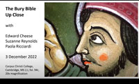 On 3rd December, 2022, The online talk entitled, "The Bury Bible close-up" was hosted by St Edmundsbury Cathedral and recorded on YouTube. Its presenters were Suzanne Reynolds, Edward Cheese and Paola Ricciardi speaking from the Founders Library at the Fitzwilliam Museum in Cambridge. Their analysis includes a forensic examination of the vellum pages, the techniques of preparation and the colours used and the making of inks.