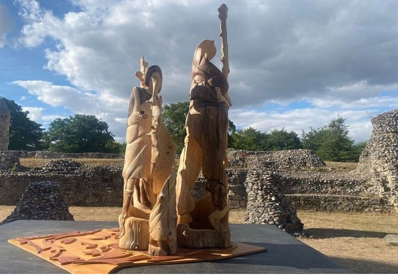 The first sculpture on display in the Crypt was the Monk by Kevin Baldwin. The second Abbey 1000 sculpture to be displayed on the plinth in the crypt of the ruins of the Abbey of St Edmund was called "The Pilgrims", by Suffolk wood Carver John Williams. It shows a variety of Medieval pilgrims who came through the centuries to visit the shrine of St Edmund. Many residents and visitors were able to see John carving the sculpture (from pine donated by Nowton Park) outside opposite the aviary in the Abbey Gardens over six months in 2021 during the covid pandemic.