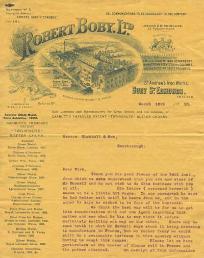 This letter from Boby's is dated 1910. This is page 1 of 2, of a letter trying to deal with a dispute about Garbutt's patent milk churn. |