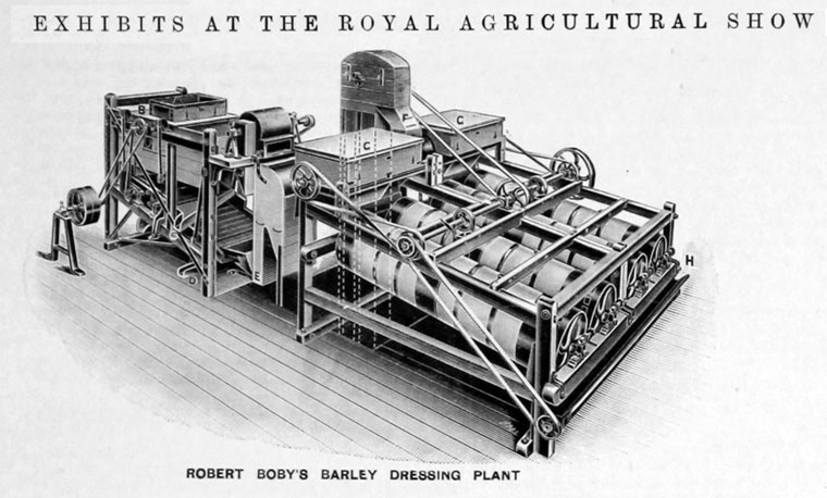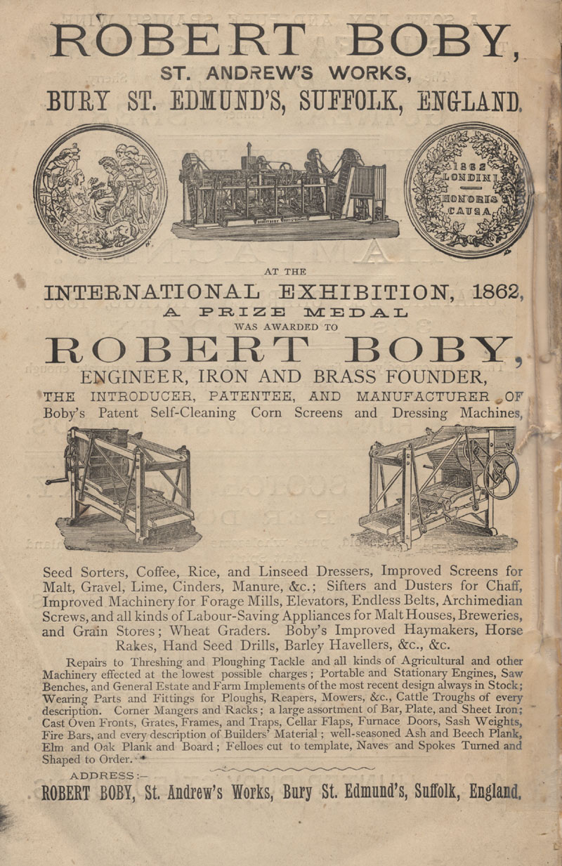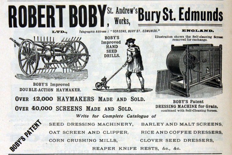 In Bury, Robert Boby, who was an ironmonger on the Meat Market, now decided to set up a factory to build this newly patented agricultural machinery. Boby had been recorded as an Ironmonger, Brazier and Turner as early as 1843, and must have been of an inventive and entrepreneurial turn of mind. In 1855 he built the Improved Corn Dressing and Winnowing machine to separate corn from chaff, and won a gold medal with it at the Chelmsford Show in 1856. He decided to go into manufacturing rather than license the invention to anyone else. Presumably Bridgman would receive a royalty on each machine sold.