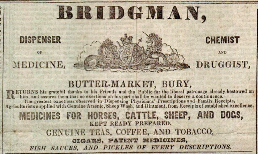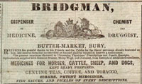 In the 1851 census, Thomas Cooper Bridgman and his family were living at 25 Northgate Street. He was recorded as aged 44, born at Clare, and given the occupation of Chemist. His wife, Rhoda Maria Bridgman was aged 32, of Hampstead in Middlesex. There was an 8 year old daughter called Charlotte Rhoda Bridgman, a 7 year old son called Thomas Harry, born at Lakenham (?) Norfolk, a 6 year old daughter, Mary Jane, a 5 year old son, Edward Charles, and 2 year old daughter Caroline. Mary, Edward and Caroline were all born in Bury. There were two servants.
