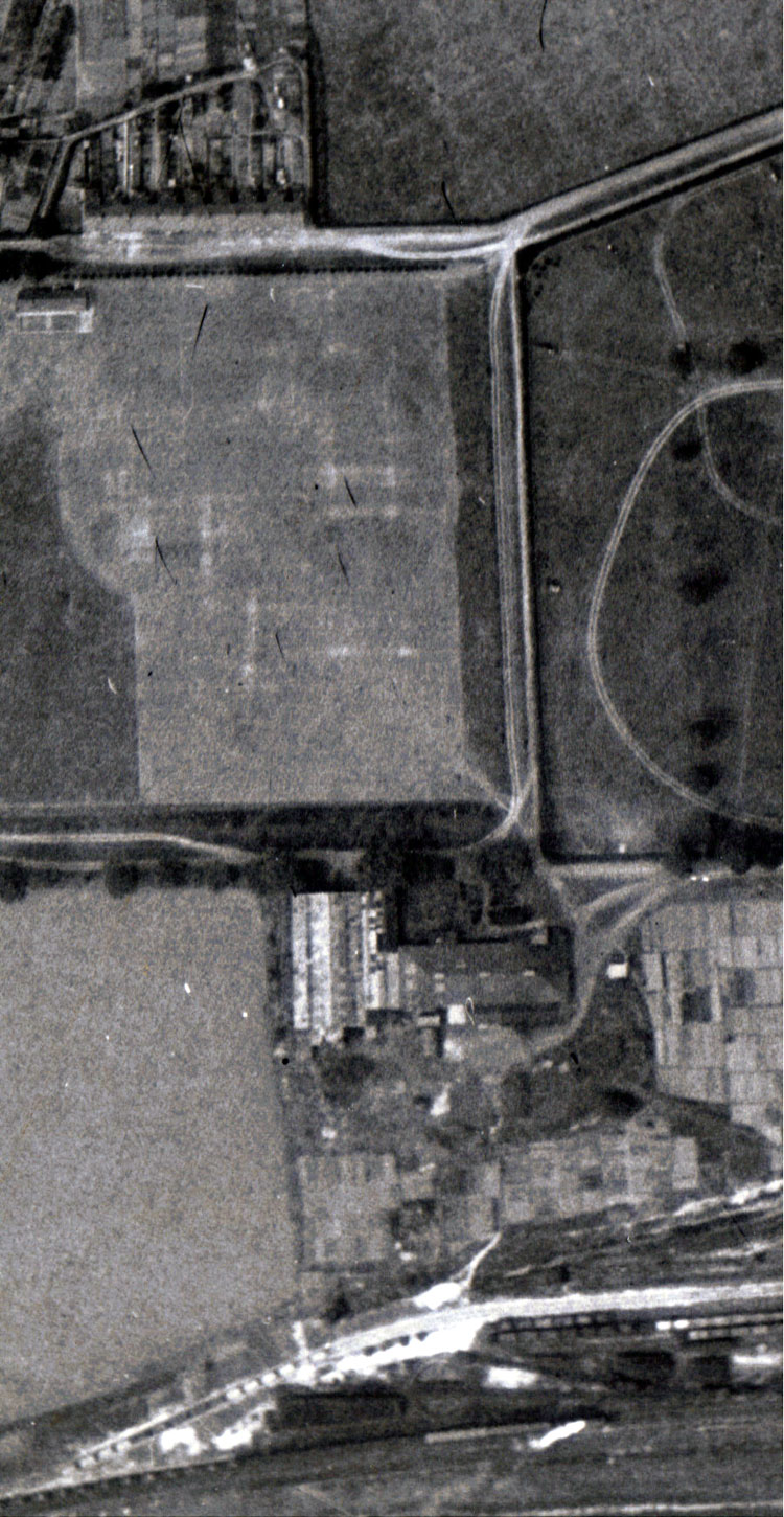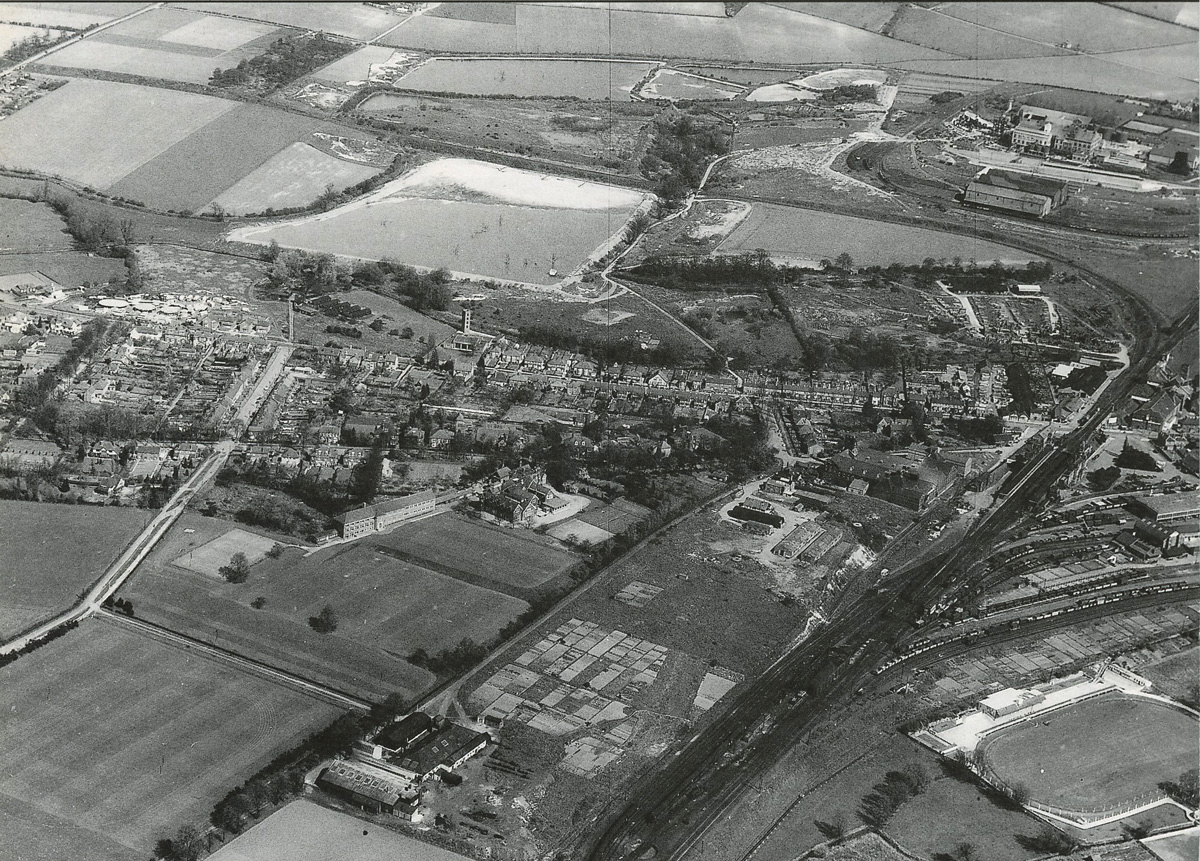 This aerial view of the Northgate area of Bury St Edmunds shows the sweep of the railway line to Thetford at the top of the picture, together with the sugar beet factory and its settling ponds. Fornham Road and its housing runs across the picture, and it is possible to make out the fire station and its training tower along that road. Avenue Approach and its continuation into the Klondyke can also be seen.