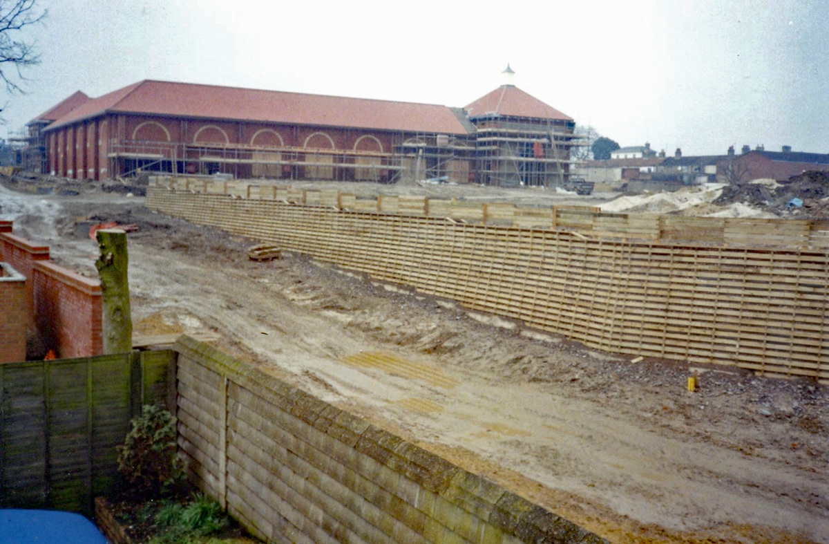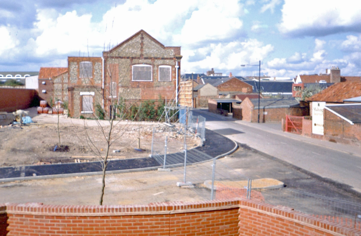 During 1992 the new Waitrose Supermarket was under construction on the site of the old and defunct Robert Boby Engineering works. We are looking up the line of the as yet unmade Robert Boby Way with our backs to St Andrews Street South. This picture was taken by Mike Peyton from upstairs at his home at 39 St Andrews Street South.