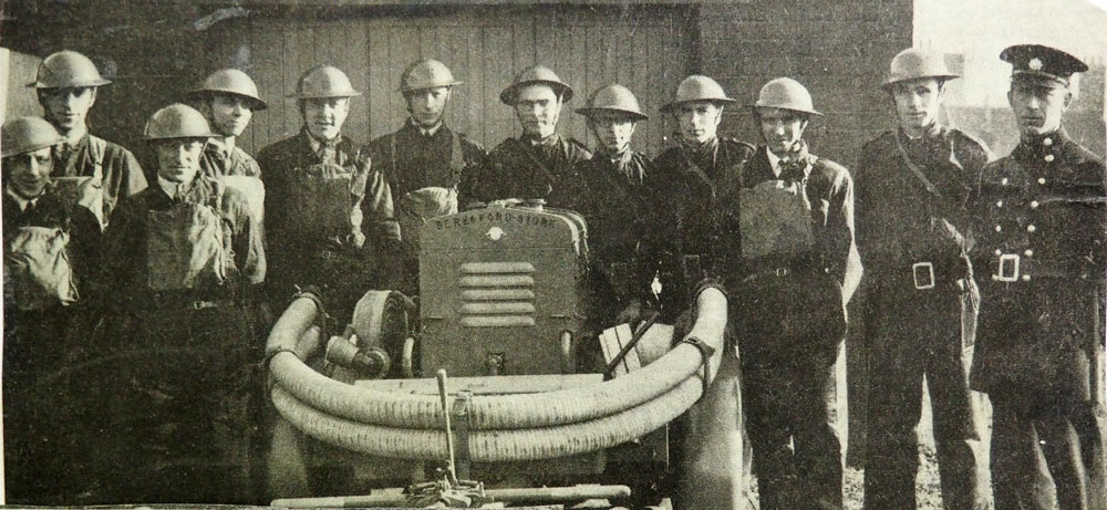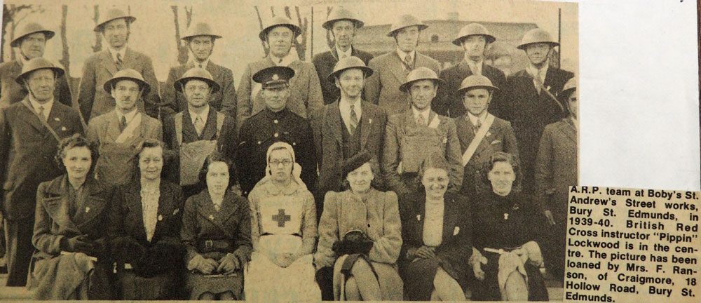 From 1939 to 1945 the firm of Roberty Boby Ltd worked day and night shifts on war work, employing up to 400 people. Like all larger organisations they organised themselves against air raids. This is the Air Raid Precautions, (ARP) Team from 1939 or 1940. The Red Cross instructor is in uniform in the centre.