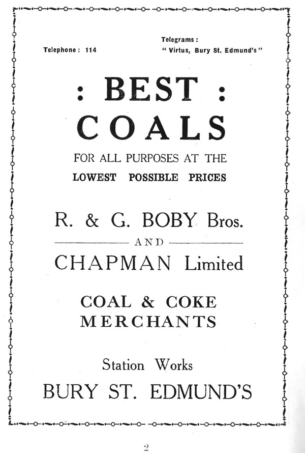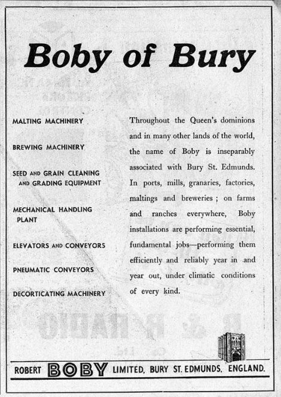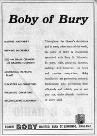 In the Bury Free Press for the 2nd June, 1953, many local firms supported the landmark coronation edition by taking out special advertisements. This one from Robert Boby Ltd, shows the range of products made and sent "throughout the Queen's dominions, and in many other lands of the world."