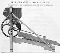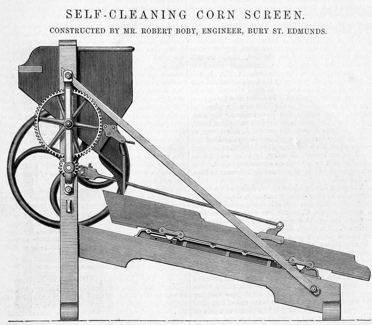 In 1852 Thomas Cooper Bridgman had been granted a patent for the Construction of screens, riddles, or sieves, being Patent Number 1747. Bridgman was a chemist in Bury St Edmunds and had since also received a patent for an improved photographic process. We can envisage that Bridgman might have approached Robert Boby with a view to making use of his inventions. Together they used Bridgman's new screen to build a prototype corn dressing machine. As an Ironmonger and seller of agricultural machines, Boby knew what farmers needed, and was in a position to sell to them.
