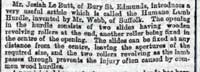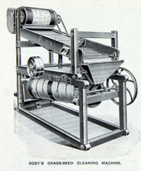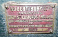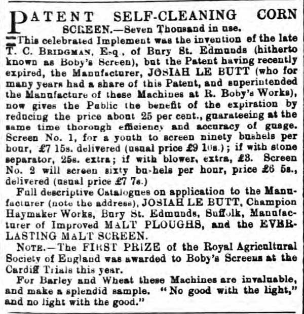 In the Bury and Norwich Post of 29th August 1855, it was reported that "an improved winnowing machine was exhibited (at the Royal Agricultural Society at Carlisle) by Mr Robert Boby of this town, the manufacturer and joint patentee with the inventor, Mr T C Bridgman." So here it is Bridgman who is credited with the actual invention of these improvements, and Boby who was in a position to be able to build it. The paper listed two specific improvements to existing designs but stated that it could not be submitted to a trial in Carlisle because of a rule that the machine should work at a fixed rate.