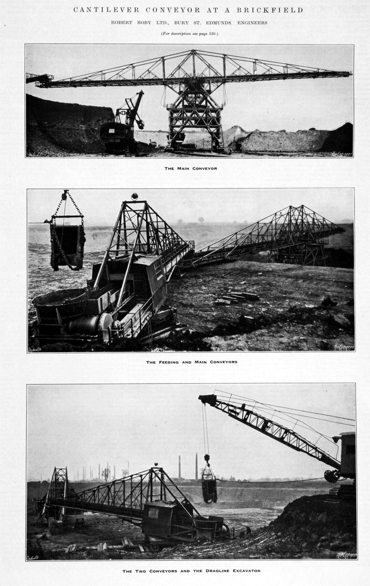 With the giant conglomerate of Vickers behind them, the firm of Robert Boby began to branch out beyond their agricultural roots. Here we see an advertisement from 1933 showing how they had built a giant gantry to work in the brick making industry. Draglines and a conveyor system were built to work at extracting clay from a brick field, as a clay pit was called.