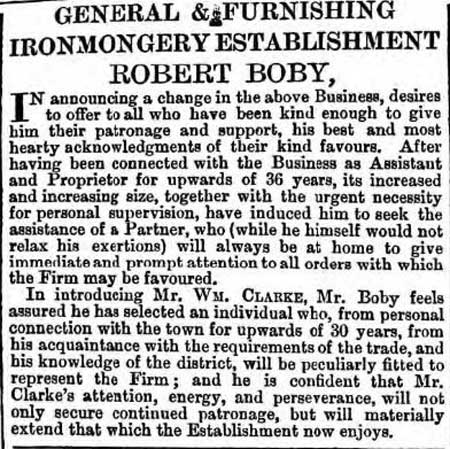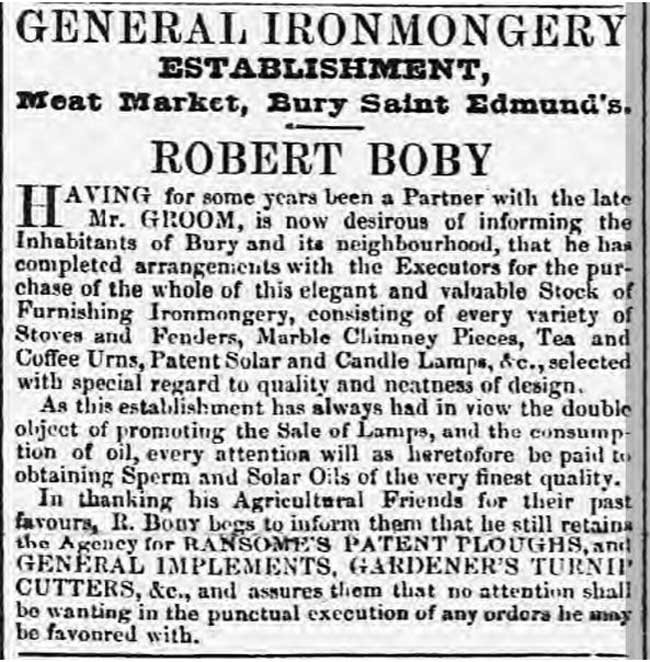 "Robert Boby, having for some years been a partner of the late Mr Groom......has now completed arrangements with the executors for the purchase of the whole of this elegant and valuable stock." The announcement also said that he would continue to sell the finest sperm and solar oils to promote the use of lamps. Also he would continue to hold the agency for Ransome's patent ploughs and other implements.