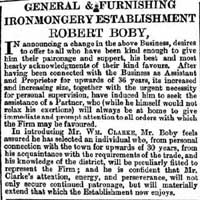 It seems that in 1830, Robert Boby joined the Ironmongery business of Mr William Groom, as an Assistant. In 1866, when he finally gave up the business, he wrote that he had been associated with that business in the Meat Market as an assistant and partner for 36 years. He would soon become Groom's partner, and would take over his business when Groom died in 1843.