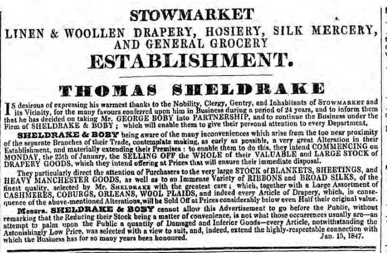 At the start of 1847, the Ipswich Journal carried an advertisement from Thomas Sheldrake on the 16th January. It stated that he was taking George Boby into partnership st Stowmarket. The resulting new firm of Sheldrake and Boby would combine their premises and rationalise their stock, starting with a grand sale of Sheldrake's existing inventory.