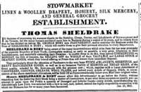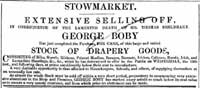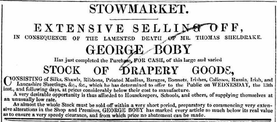 At Stowmarket Thomas Sheldrake died, proprietor of a Drapery business. His entire stock was bought by George Boby, also a draper, and his esrtwhile partner, who advertised an "Extensive Selling Off", of all these goods at below the cost of manufacture. See Bury and Norwich Post, 13th July 1853. Their partnership was naturally dissolved by Sheldrake's death, and was announced in the Perry’s Bankrupt Gazette for 7th January 1854. "Debts by Boby" meant that George took over all the outstanding debts along with Sheldrake's share of the assets which he paid for.