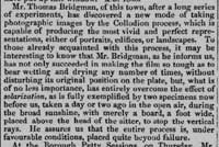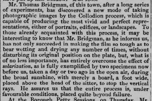 In 1853 at Bury, Thomas Bridgman invented a new way of using the collodion photographic process, as reported in the Bury and Norwich Post of 1st June, 1853.