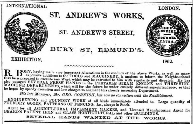 Robert Boby was in business in Bury St. Edmunds as an 'Ironmonger, Red and White Lead Dealer, Brazier and Turner.'