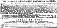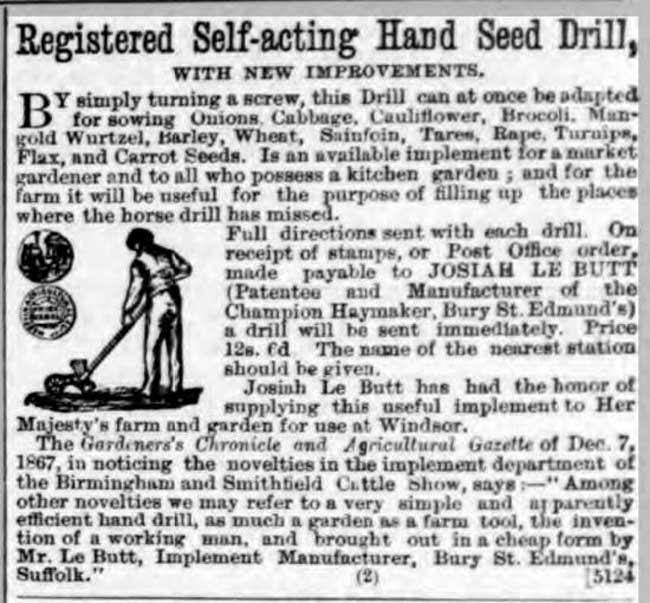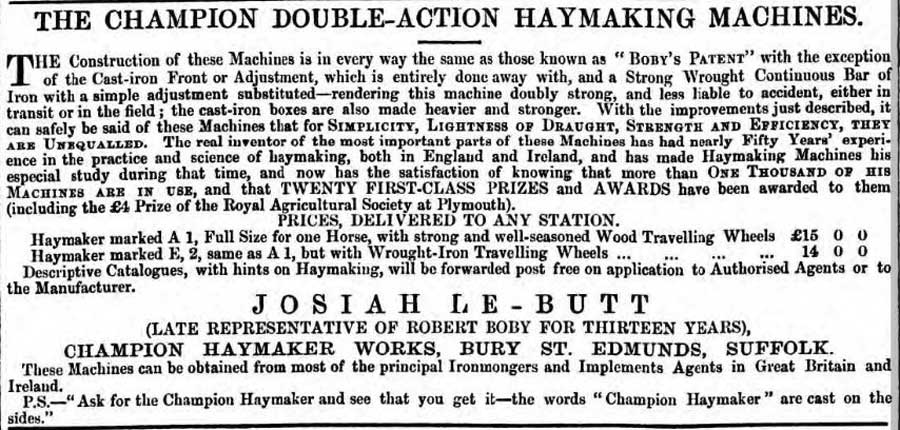 From later claims made by both men, it seems that George Cornish was employed at this time by Robert Boby to run the machinery production side, and Josiah Le Butt was employed as Boby's travelling representative. Both men would come to understand the farmers' requirements and were key elements in Boby's success in building up his factory business.