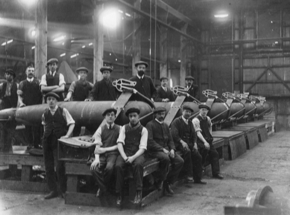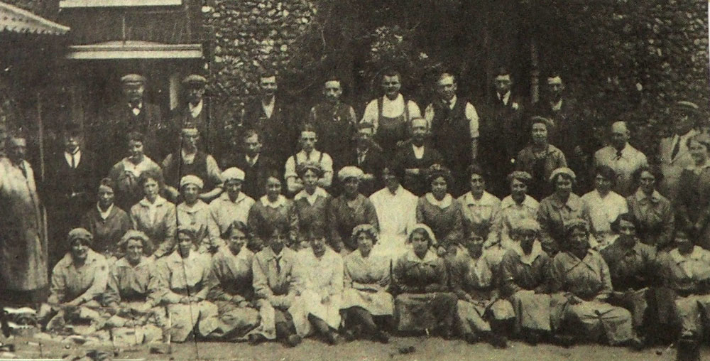 This picture shows the men and women who were working on munitions at Robert Boby Engineering during the First World War.