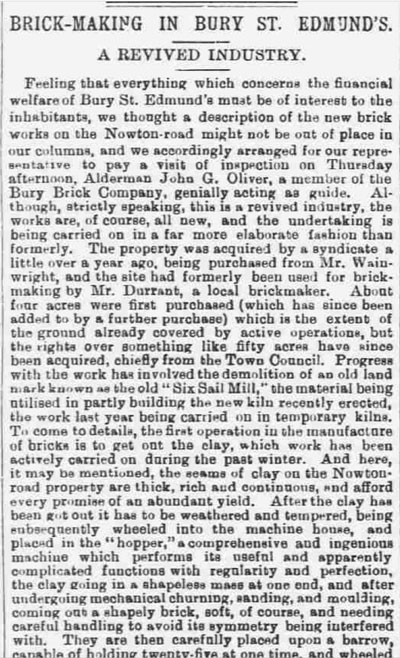 On 4th July, 1899, an optimistic article was published in the Bury and Norwich Post, entitled "Brick Making in Bury St Edmunds - A Revived Industry." The full article is available by clicking on the thumbnails, but some salient points are summarised below. In addition the article also explains the full brick making process as it was at the time.