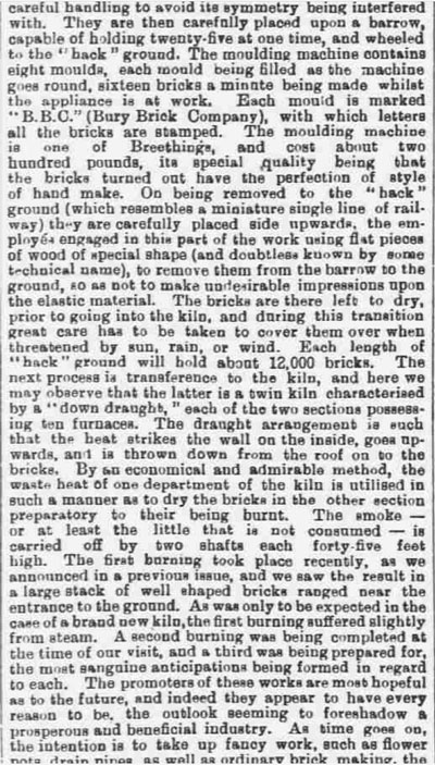 In the Bury Free Press for 10th March, 1900, the company were advertising as follows:- "Wanted, good steady Brick Yard Hands- Apply Manager Bury Brick Co., Nowton Road, Bury St Edmunds."