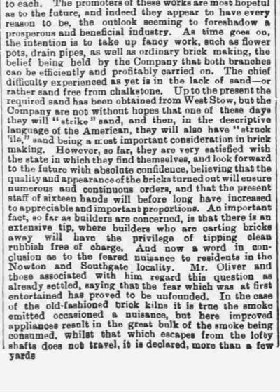 The article explains that the works are, of course, all new and the undertaking is being carried on in a far more elaborate fashion than formerly. The property was acquired by a syndicate a little over a year ago, being purchased from Mr Wainwright, and the site had formerly been used for brick making by Mr Durrant, a local brickmaker.