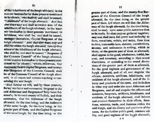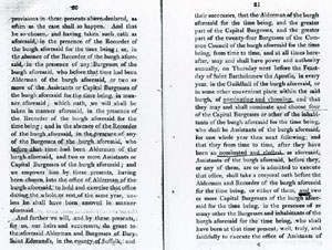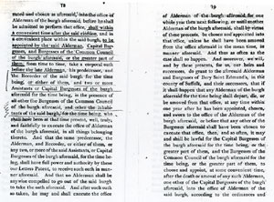 Pages 16 and 17 Twenty four Burgesses appointed for life. Defines power to remove members for bad management or ill conduct. Annual election of Alderman from Capital Burgesses. |