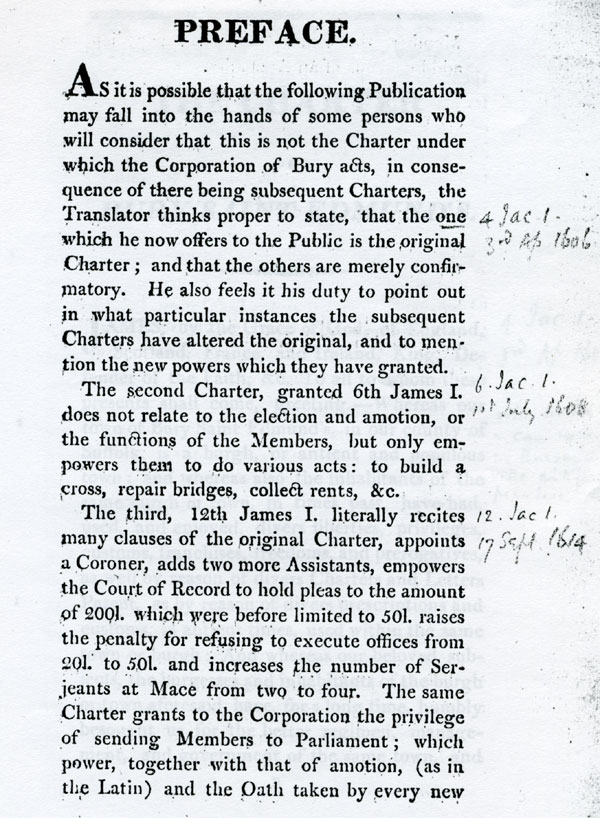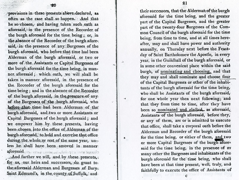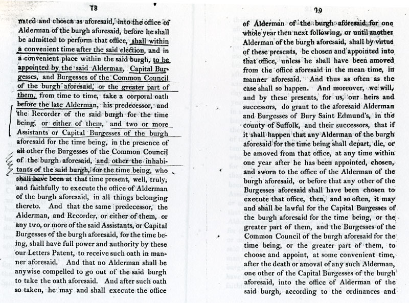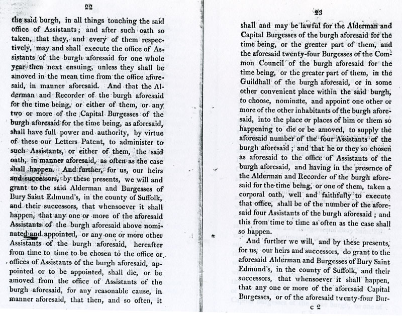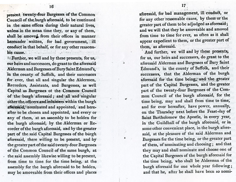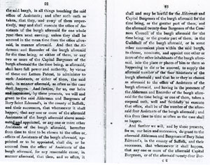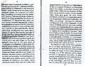 6 and 7 These latters patent make the inhabitants into one corporate body, "The Alderman and Burgesses of Bury Saint Edmunds".. |