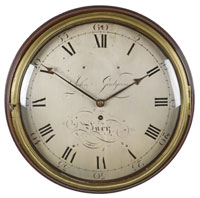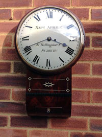 Napoleon Aprile, Sudbury, 1839-1864 Here we can see an early 19th century convex drop dial fusee wall clock by Napoleon Aprile, 16, Ballingdon street, Sudbury, Suffolk. It has a Mahogany case, the back box with brass inlay, radiused to the wall with locking bottom door and pendulum side access door. The 12" original white painted convex dial and blued steel hands are protected by a cast brass original convex glazed bezel. The line fusee movement has shaped shouldered plates separated by knopped pillars. Dimensions are 12" diameter dial 24" height, and the date is Circa 1840. It was for sale fully restored and guaranteed for the price of £2500.00, or €3397.75 or $3708.25 in January 2016 at Cove Clocks of Farnham in Surrey. MARRIAGES. Aprile- Graves.- Feb. 4th, at St. Gregory's Church, Sudbury, by the Rev. T. L. Green, Rector, Napoleon Aprile, of Ballingdon, to Martha Jane, eldest daughter of the late Mr. Graves, of Bury St. Edmund's. Barnes- Walker. - Feb. Napoleon and Joseph Aprile were brothers. Joseph seems to be the elder. They are recorded as watch and clockmakers and jewellers in Directories for 1839 and 1855, and also as Silversmiths and tobacconists in 1864 at Ballingdon. Haggar and Miller noted that Long Case clocks and barometers were known to survive with their names.