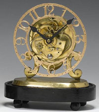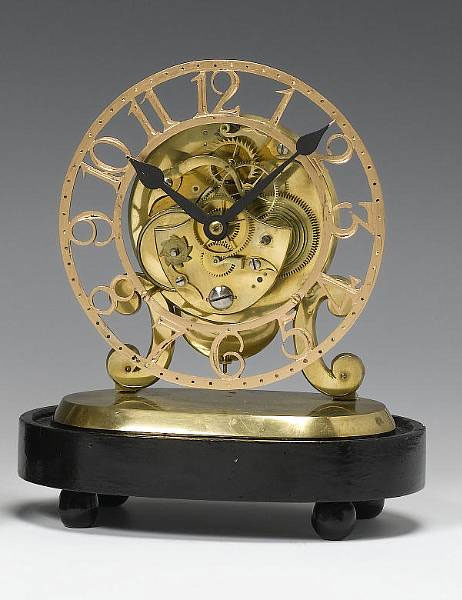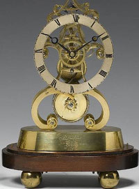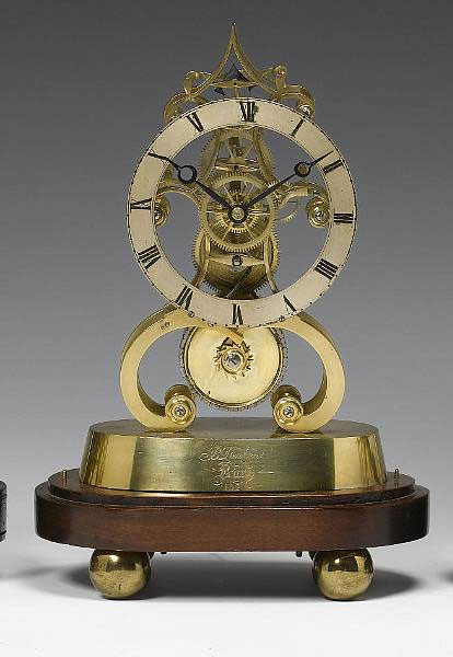 Bonham's description was as follows: "A very rare second half of the 19th century brass skeleton timepiece of two week duration John Pace, Bury St Edmunds, 273 the frame cast of 6mm thick plates with chamfered edges formed as a circle on a pair of scroll supports with central vertical tapering support, the skeletonised arabic chapter ring with milled edges and dotted minute marks set in front of an open circular front plate with chamfered inner edge to a solid circular backplate united by two turned pillars, the going barrel movement configured so as to rise up the central section in a straight line, with five spoke crossings of extreme delicacy terminating in a deadbeat escapement, the pendulum with 'axe-headed' bob and steel rod with rise and fall regulation via a screw above, to the rear of the backplate a series of three pulleys united by very small fusee chain combine to drive the hands, the whole mounted on a signed and numbered chamfered oval base with additional base below on an associated mahogany plinth under a glass dome. 36cms. (14ins.) high" It was signed 'John Pace, Bury St Edmunds, 273', and this example had a two week duration movement.