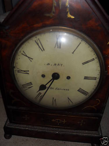 David Ray, Bury St Edmunds and Brandon, 1844-1846 David Ray was in the 1844 Directory at 25 Hatter Street. In the same Directory he was also found at Brandon High Street. In 1846 he was listed at Brandon only. He is known in the literature from a few painted dial Long Case clocks. However, this bracket clock appeared on Ebay in September, 2008. Click on the picture to see the dial in close-up. There were also a number of clockmaker Rays associated with Sudbury, but Haggar and Miller stated that it is not known if David Ray was related to them.