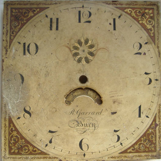 Robert Garrard, Bury, 1823-1846 Garrard is known from an oak long case clock, with a square painted dial. The dial illustrated here is signed "R. Garrard, Bury", and was sold on Ebay in October 2007. There was no mechanism attached. He was recorded in the Directories from 1823 to 1846 located in Guildhall Street. In 1830 he was located at number 37, but by 1846, he was at number 55. In the 1855 Directory a Robert Green Garrard was a Watch and Clock maker at 63 Guildhall Street. In the 1864 Directory there was a George Garrard at 55 Guildhall Street. A Jacob Garrard was selling clocks at Long Melford in 1855, and a James Garrard at Woolpit from 1844 to 1855.