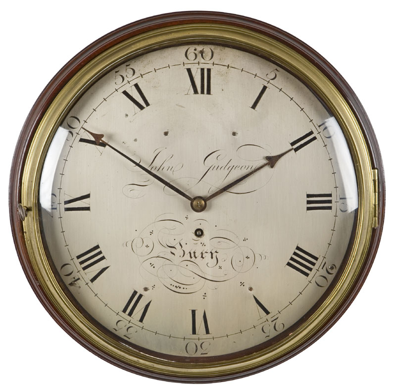 John Gudgeon, Bury 1785-1835 Clock dealers Carter Wright have a showroom in Nailsworth, Stroud, Gloucestershire. From 6 to 20 October 2007 they showed an exhibition of the renowned Richard Amos Collection of wall clocks. The collection comprised 30 clocks ranging in date from the 18th to the 20th centuries which were offered for sale at prices from £800 to £35,000. Every kitchen used to have its handsome clock on the wall and the Amos collection boasted several fine examples of wall clocks that would enhance any home today. Among them were three mahogany dial clocks dating from the reign of George III. One of these clocks was by John Gudgeon of Butter Market, Bury St Edmunds, circa 1805, with a silent escapement and priced at £5,500, The other two comprised one by Jabez Smith, London, circa 1790 , and one by Samuel Hunter, London, circa 1790. The clocks of these London makers were on sale for the same price, or less than, that of Gudgeon. John Gudgeon married Mary Lumley in 1785, and went into partnership with her widowed mother, also called Mary Lumley. Her late husband had been George Lumley, who was a watch and clock maker in Bury. John Gudgeon therefore most likely took over Lumley's premises in 14 Abbeygate Street at this time, and therefore spans the 18th and 19th centuries. In 1800, when Mary Lumley died, John Gudgeon continued at the shop at 14 Abbeygate Street. He seems to have let his son George take over at Abbeygate Street in 1815. In Directories for 1823 and 1830 John Gudgeon is now recorded as a Watch and Clock maker in the Buttermarket. He died in 1835, leaving his son George to take over any business interests that he still held. John Gudgeon also made watches. John Gudgeon of Bury left a watch in a double silver case, numbered 567, from 1805, now in the Gershom Parkington Collection. Also a watch in a double case with a tortoiseshell outer case. It has a verge escapement from c1794, and the maker's number of 27. John Gudgeon's work both pre-dates and overlaps with his son George Gudgeon listed below.