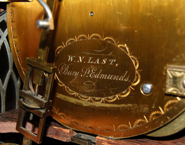 Modern day jeweller's Ernest Webb, established at 4 Risbygate Street in 1952, owns a bracket clock marked W N Last, Bury St Edmunds, dated to the early 19th century. It has a perpendicular arch, and the back plate is round rather than the more usual square. The face is signed "W. N. Last. Bury", but it cannot be said that the painting is of a high quality. The backplate is also signed, "W. N. Last Bury St Edmunds", but this is engraved, and is much better looking than the face. The 8 day movement had an unusually large mainspring which had snapped, and was replaced by Peter Webb. (NB The 1855 Directory listed a William B Last as a Watch and Clock maker at 41 Abbeygate Street.)