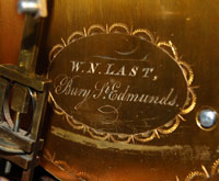 William Nelson Last, Bury, 1830-1864 Pigot's Directory of Suffolk for 1839 lists a William Nelson Last of 3 Abbeygate Street, under its category of Watch and Clockmakers. By 1844 White's Directory listed him under Watch and Clock makers as Wm Last (& chronometer). Last clearly thought himself a cut above ordinary clockmakers, and by 1844 he had moved to 10 Butter Market. Last seems to have been forever on the move. In the Directory for 1846, he was located at the Corn Exchange. By 1855 he was to be found at 15 Whiting Street, and by 1864 he was located at 44 St Andrews Street. He seems to have been a very good engraver, and his signature has been found on a Sundial which was sold by John Pace. |