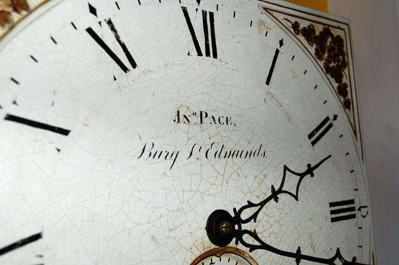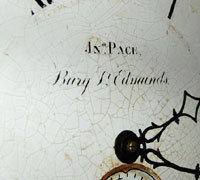 John Pace, Bury St Edmunds, 1823-1855 One man from the list of 19th century clockmakers in Bury towers above the rest. He was John Pace, a man who could make watches and the most exquisite clocks. He seems to have delighted in making small skeleton clocks, designed so that the mechanism was an ornament and showpiece of itself. John Pace had his shop in Abbeygate Street from 1823 until 1855. In later years the shop was recorded in the Directories at number 19 in that street, and may well have been there from the beginning. Pace was a leading figure in the Society of Friends, and was Secretary of the local Quaker Meetings from 1827 to 1832. John Pace worked in Bury St Edmunds making all types of clocks and watches, and had a good reputation for his skeleton clocks. He also patented a night time piece in 1833, which was number 6506. He could also produce barometers and was clearly willing to try all sorts of precision work in his workshop. The Long Case clock shown here is one of his bread and butter clocks, signed, "Jn. Pace, Bury St. Edmunds.", on a painted dial. It has a 30 hour movement, and still keeps good time in a private house in Bury St Edmunds. The dial is shown below: