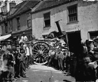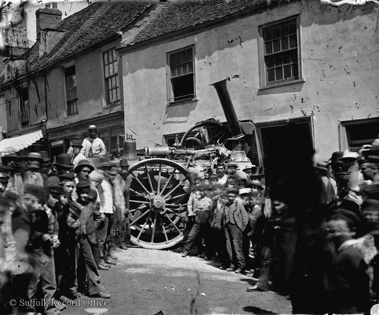 An Alfred Edward Tolladay was recorded in later Directories from 1865 to 1891. In 1865 he was located at 118 Northgate Street, and by 1891 he was at 11 Hatter Street. Tolladay's is also remembered because of a notable traction engine crash. This picture is from the Spanton-Jarman Collection at Bury St Edmunds Record Office. The glass negative of approximately 305mm x 254mm, was produced by a wet plate process so was probably made sometime between 1870 and 1890. A runaway steam engine has crashed into this row of houses in Northgate Street. The accident attracted quite a crowd, and the photographer himself must have been quite a novelty too. The premises behind the engine belonged to Alfred Edward Tollady, this building was his beer house at 117. White's 1874 Directory lists him as a 'watch and clock maker, jeweller, glass and china riveter, umbrella maker and lamp dealer', at number 118 Northgate Street.
