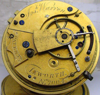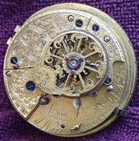 The first watch movement shown here is numbered 837, and was recently sold by Allan Mitchell, who also took this excellent photograph. Details were supplied by the owner, Mr John Hutton, who kindly contacted me in 2018. It is a high quality verge movement and Mr Hutton suggests that its date must be somewhere between 1818 and the mid 1830s. |