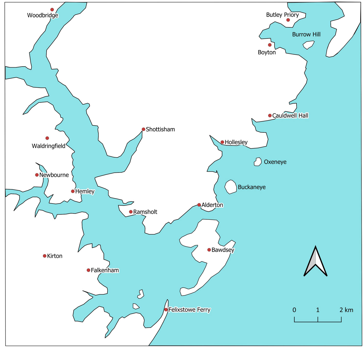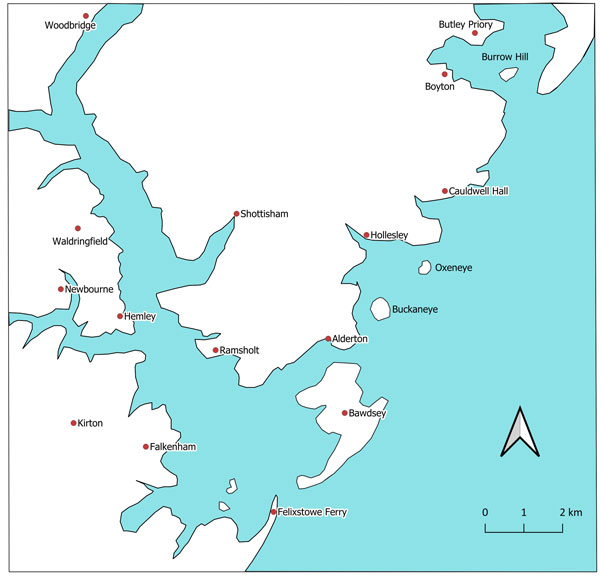 The The River Deben and the coastline by around 1600. This is Figure 31 in the SIAH article. While deposition has encouraged further land reclamation, Bawdsey Cliffs have experienced erosion. Goseford port is now associated with the Deben and Bawdsey Fleet area as Oxeneye has become cut off from the sea. |