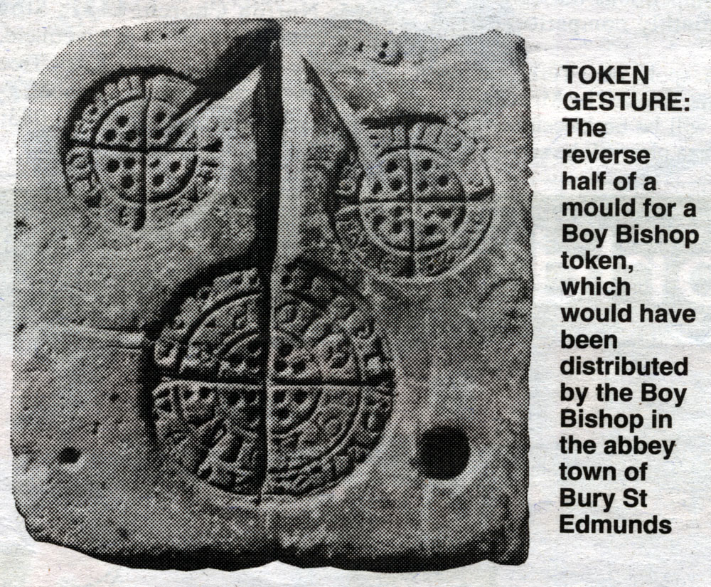 In England, the main centre of both production and use of these tokens was Bury St Edmunds, although they were issued in many places on the continent. In Bury the Boy Bishop was in existence by 1418, but the first tokens seem to have been issued from about 1480. They were distributed by the Boy Bishop and probably exchanged for sweetmeats or alms at the Abbey almonry or by charitable local merchants. The distribution of their findspots suggests that they were also used as small change.