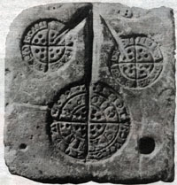 The tokens cast at Bury St. Edmunds were based on the coins of the time. They occur in three sizes - penny, half groat (2d), and groat (4d), and were made of lead alloy. The half groat is the least common. The neatest pieces are probably the earliest. Illustrated here is a mould used to produce these tokens, showing the reverse side of the tokens, and used to produce three items at a time. This mould was found in the Abbey grounds in Bury St Edmunds.