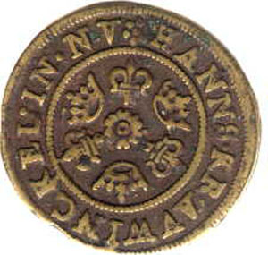The commonest type of reckoning counter, often found in Suffolk, is that made in Nuremburg by Hans Schultes (1550 to 1574), Hans Krauwinkel (1580 to 1610), Matthew Laufer (1618 to 1625) and Wolfgang Laufer (1618 to 1660). They favoured the Reichsapfel (cross on globe) and the winged lion of St Mark the Evangelist, or a pattern of alternating crowns and fleurs-de-lys.