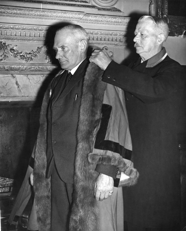The Mayor, Alderman E J Sewell and Sword Bearer Mr R D Dorling Robing the Mayor before the meeting. Mr Dorling had 21 years service with the corporation following 21 years in the Royal Dragoons. |