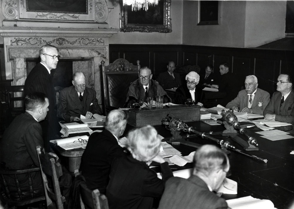 Alderman F T Bright replies to the Mayor, Alderman Sewell, after the Mayor had reported on an address by Aneurin Bevan at the Housing Conference. Alderman Bright was saying that shortages were very real, and delays were not the fault of municipal authorities. "Pipes ordered last March are now needed to complete some of our houses, but they may not be available until next March." |
