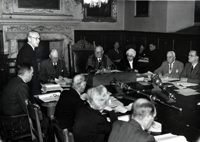 Cllr H I Jarman, (Chairman of Museums and Libraries Committee), Cllr R V Willcox, (Chairman of Housing Committee), and Cllr R J Gooch Cllr Willcox stands to present the report of the Housing Committee, saying that 21 houses were completed by private builders and 4 by the council. The Minister of Health wanted 4 council houses built for every one house built by private enterprise, and might ban further private building until that proportion was established. |
