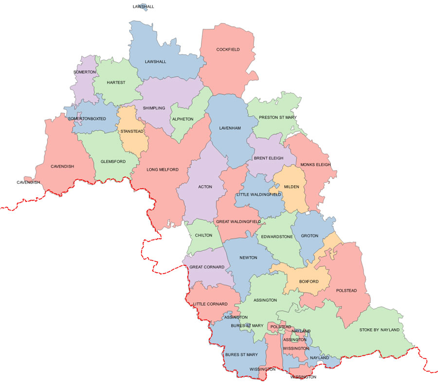 The red dashes are the line of the modern county boundary, and indicates that Sudbury in 1086 was considerably smaller than its modern boundaries.