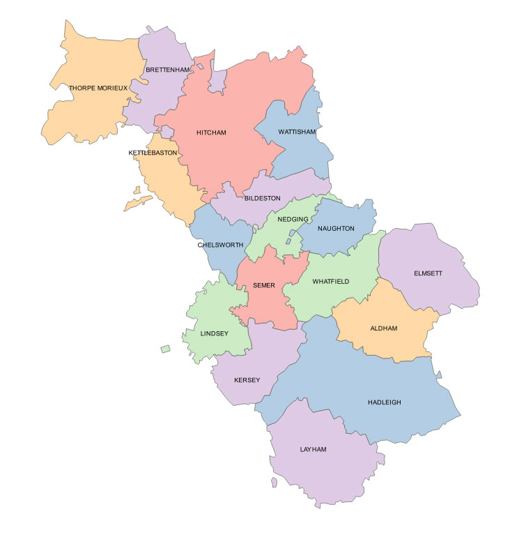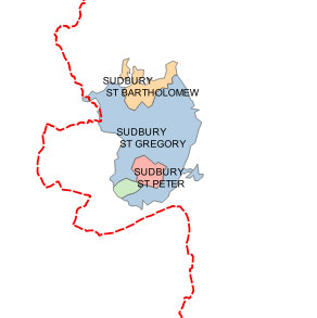 Our map shows Sudbury was included as part of Thingoe at the time of Domesday. This odd inclusion might have been made to compensate Thingoe for the reduction in taxable capacity when Bury St Edmunds was given some tax exemptions as part of its monastic grants in the 10th and early 11th centuries.