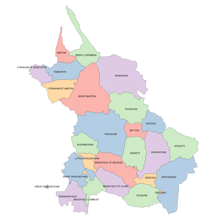 "E. of Thingoe hundred and N. of Babergh and Cosford hundreds, bounded by Blackbourn hd on the north, where it includes the parishes of Woolpit, Tostock, Thurston, Pakenham, Gt Livermere, Ampton, Timworth and Fornham St Genevieve. Its northern boundary has a curious shape with two long, narrow strips reaching up towards a place called Rymer Point, apparently a spot of some importance in early days, for the boundaries of all the parishes in a wide circle round it, nine in all, are made to meet there."