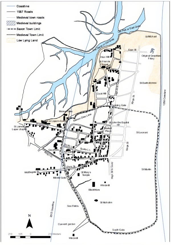 This reconstruction of old Dunwich comes from the "Dunwich Project 5883 Final Report" by David Sear, Andy Murock, Tim LeBas, Paul Baggaley and Gemma Gubbins, of March, 2013. This has resulted from a combination of historical records, coastal change analysis, geophysical surveys, diver surveys and sonar imaging. |