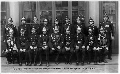 The Brigade in the early 1930s. I had an email from Mr Leonard Lawson in April, 2018, telling me that his father, Cyril Lawson, is standing, 2nd from right. Cyril Lawson joined the Fire Service in 1928, and is also in two other pictures shown below.