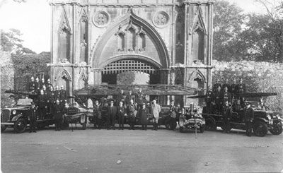 Bury St Edmunds Fire Brigade with their Engines in front of the Abbey Gate on Angel Hill. Note that to the left is a small engine with the inscription “Westgate Fire Brigade”. This presumably is the Brewery Engine. Note the Mayor in attendance. (This picture has been published in "Firefighting in Suffolk" by G Saward, 1996. Saward dated this picture to 1930, and noted that the turntable ladder in the centre belonged to the Brewery Brigade. The town and brewery brigades worked closely together. The brewery brigade had existed since September 1888.) |