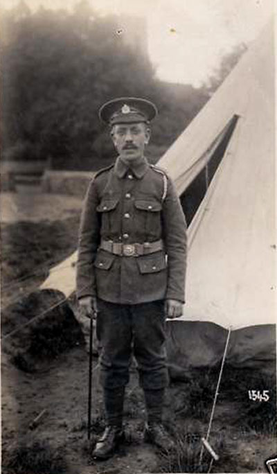 Individual soldiers are not always identified in these postcards. However, this is R Barkham 415 Lowland Field Company Royal Engineers. He has written on the reverse " Yours Truly Robt. Barkham ". He enlisted on 18.3.1915 and served with the 2/1st London Field Company, Royal Engineers. Posted to France on 23.2.1916 and was at some point attached to the 415th Lowland Field Company, Royal Engineers. His address on discharge was 45 Edinburgh St, Swindon. Birth records suggest he was born in Bury St Edmunds and registered Dec 1881? and married in 1902. Photo by W.R. Burrell, Fornham St Martin, Suffolk. |